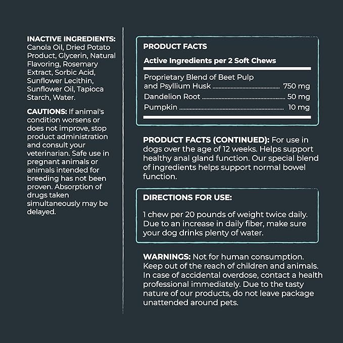 - More Waggin', Less Draggin': Our vet-formulated soft chews harness a powerful blend of ingredients - Pumpkin, Beets, and Dandelion Root. Give your pup the anal gland support they need and say goodbye to the scoot! Your carpets will thank you!
