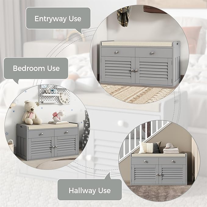 - Modern Storage Bench for Any Scene -- A neutral color matching plus louvered design door will add stylish look to your home. Breathable Cabinet Doors, cushion seating and storage in one feature is very suitable to as a shoe bench for entryway, a storage bench for closet room, or a storage chest in end-of-bed.