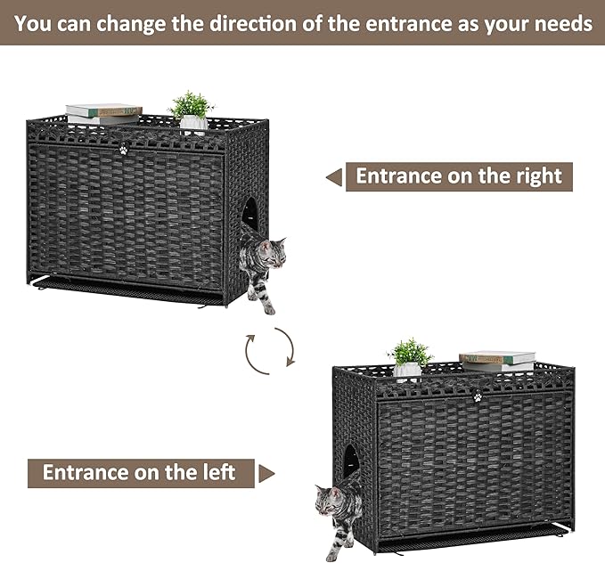 - 【More sunshine, Less odor】 The cat litter box enclosure offers a private place where cats feel safe to answer nature’s call. The rattan cat litter box enclosure can transmit light, allowing cats to enjoy the sunshine while blocking odor emission.
