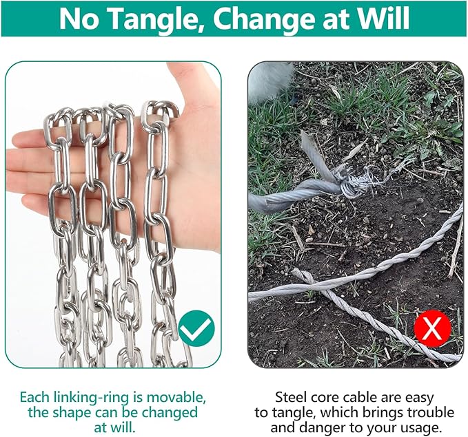 - 【Durable and Chew Proof】This metal tie-out cable is made of metal, and the chain and clasp can withstand the dog's chewing and dragging, without fear that the dog's teeth will penetrate it. The zinc coating on the surface protects the chain dog leash from rain and soil erosion and extends its service life.