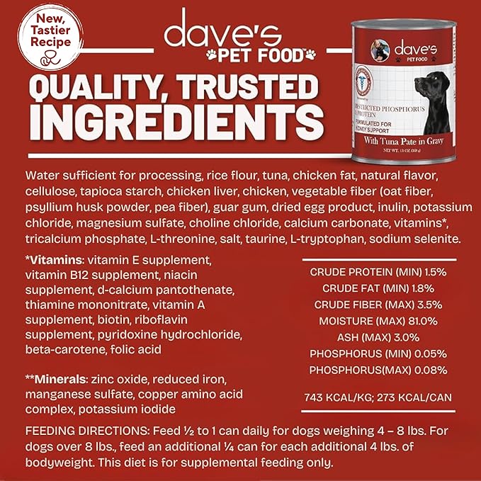 Dave's Pet Food Kidney Care Dog Food (Tuna Pate), New Recipe! Wet Renal Dog Food, Low Phosphorus, Renal Kidney Support, Vet Formulated, 13.2 oz, (12 Pack)