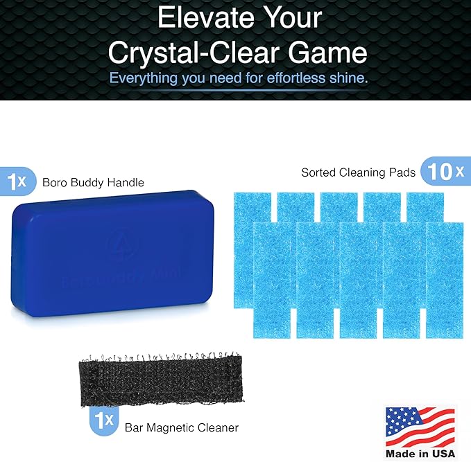- ✅ COMPACT SIZE - We revolutionized glass cleaning with the original BoroBuddy magnetic glass cleaner. Now we've created a Mini version that can fit harder to reach places, grooves and smaller glass pieces. The SnowTree BoroBuddy mini handle measures 1.5" x 1" with an inside cleaning surface of 1" across. Includes 11 replacement cleaning pads.