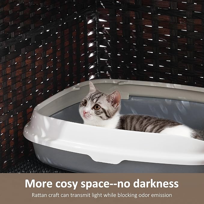 - 【More sunshine, Less odor】 The cat litter box enclosure offers a private place where cats feel safe to answer nature’s call. The rattan cat litter box enclosure can transmit light, allowing cats to enjoy the sunshine while blocking odor emission.