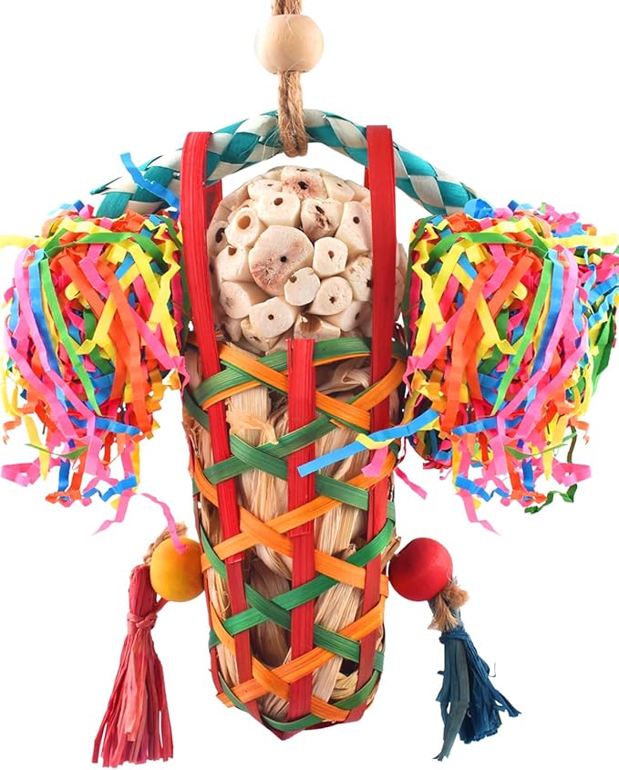 - SAFE BIRD TOY: Made of natural bamboo, corn husk, sola ball, wooden bead and chewable confetti, with food colorants, colorful and naturally safe to chew, your bird will surely enjoy it