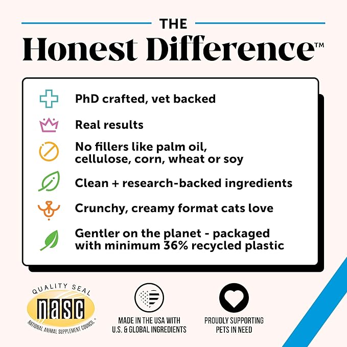 - THE HONEST DIFFERENCE: Our products are made with clean, science-backed ingredients for results you can trust, & with no fillers, artificial preservatives, colors, or flavors, you'll have no doubt your cat is getting the best. Proudly supporting pets in need nationwide & using recycled plastic in our packaging, there's also no doubt that we're committed to doing our best. -- All products are manufactured in the U.S.A. | NASC Member Company