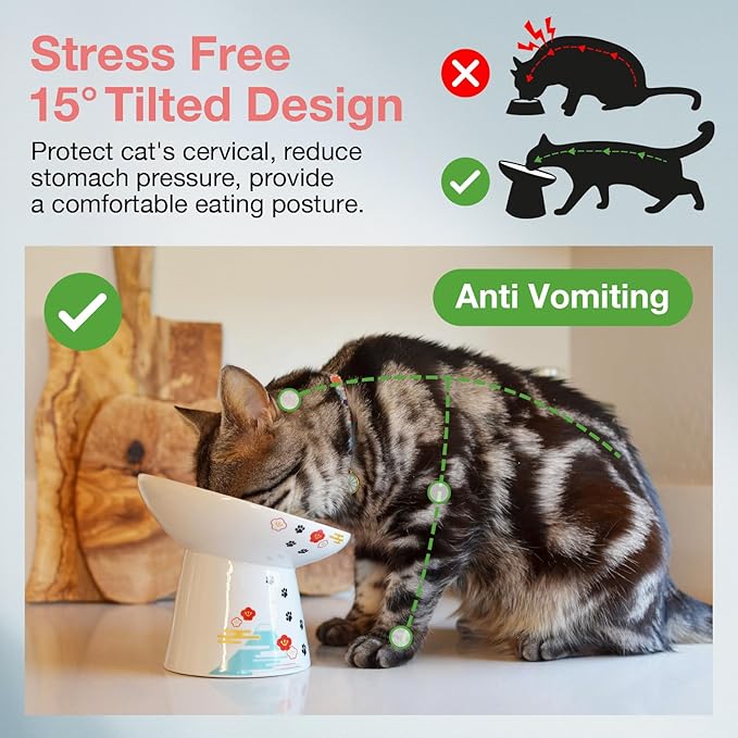 - Our first tilted bowl is joining Necoichi’s Raised Food Bowl lineup! Food stays centered, and the tilted lip makes it easier for your cat to eat without whisker or neck fatigue from the perfect height.