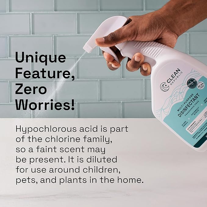 - Unique Feature: Hypochlorous acid is a part of the chlorine family, so there may be a faint scent. The hypochlorous acid is diluted for use around the home with children, pets, and plants