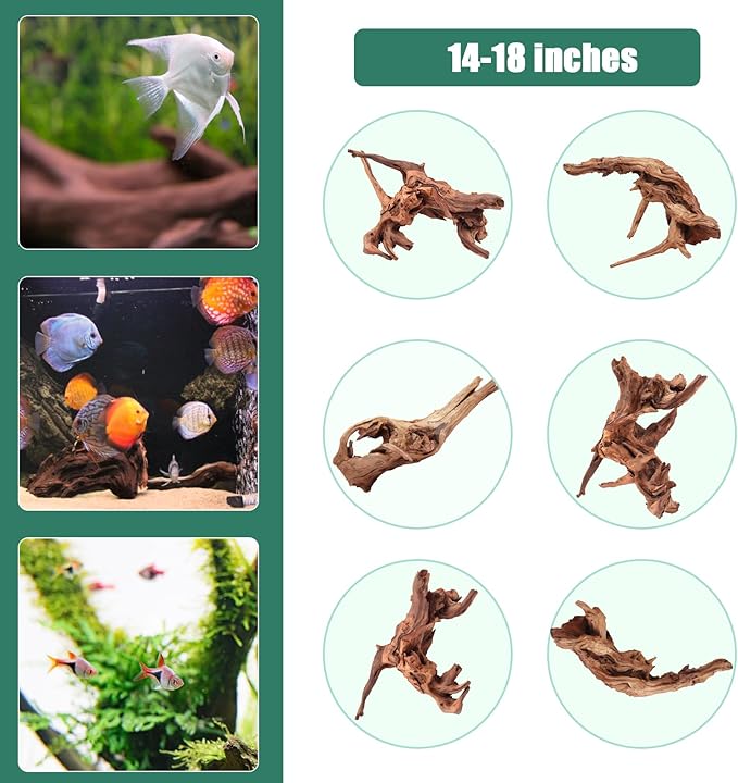 - WIDELY USED -- Natural drift wood is 14~18 inches or longer in length. You can place them in various aquariums fish tanks decoration, wooden boxes and glass terrariums according to your creative needs. Great for aquatic landscaping, sandpit climbing pets, such as fish, shrimp, turtles, bearded dragons, lizards, spiders, snakes, hermit crabs and more. Adds a natural, realistic view and provides them with a hiding place and more comfortable habitat.