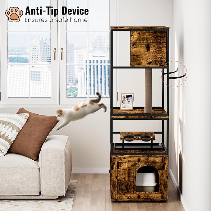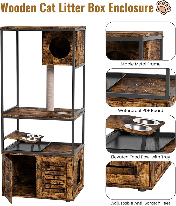 Lamerge Cat Tree with Litter Box Enclosure, All-in-1 Large Cat Litter Box Enclosure, Cat Condo with Scratching Posts and Cat Feeding Bowl, Rustic Brown