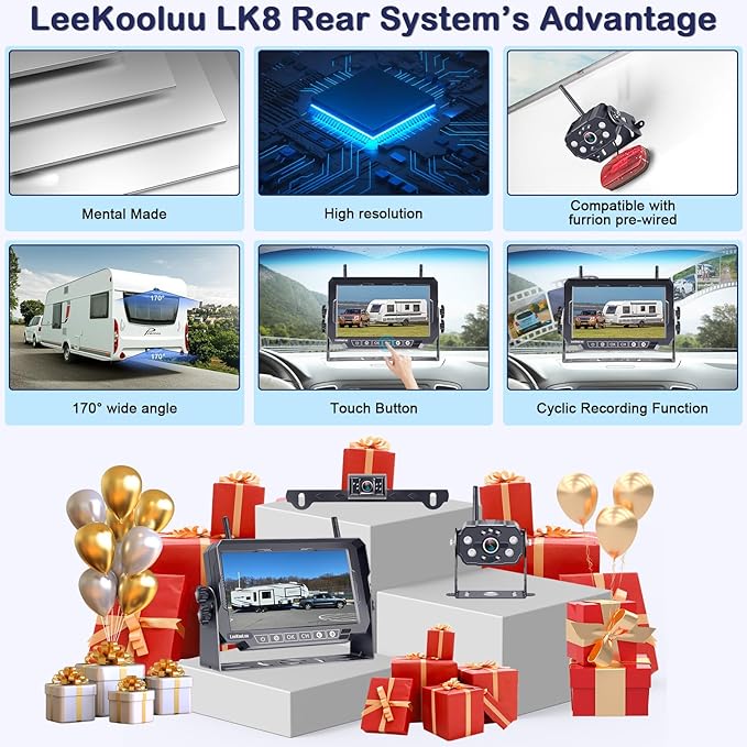 - 100% Waterproof: The backup camera for rv utilizes the latest nano-coating sealing technology with IP69 grade waterproof performance, which can work perfectly and provide clear images in extreme environments from -22°F to 176°F. This rv camera system wireless is like a brave guardian from any water or fine particles, tenaciously resisting wind, rain, dust, high and low temperatures, which enhances the safety index and strengthens the service life, providing a safer guarantee for driving.