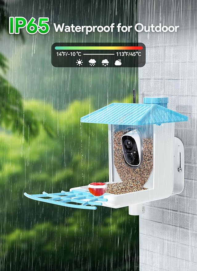 - 【DIY Different Add-ones & Friendly Design】Our wireless outdoor camera bird feeder with wider and stronger structure allows you to add different add-ons and customize your feeding station. The included 4pcs fruit forks and 1pc mini hummingbird feeder transform it into a versatile feeder suitable for various bird species. And IP65 waterproof bird house design, suitable for use in any weather