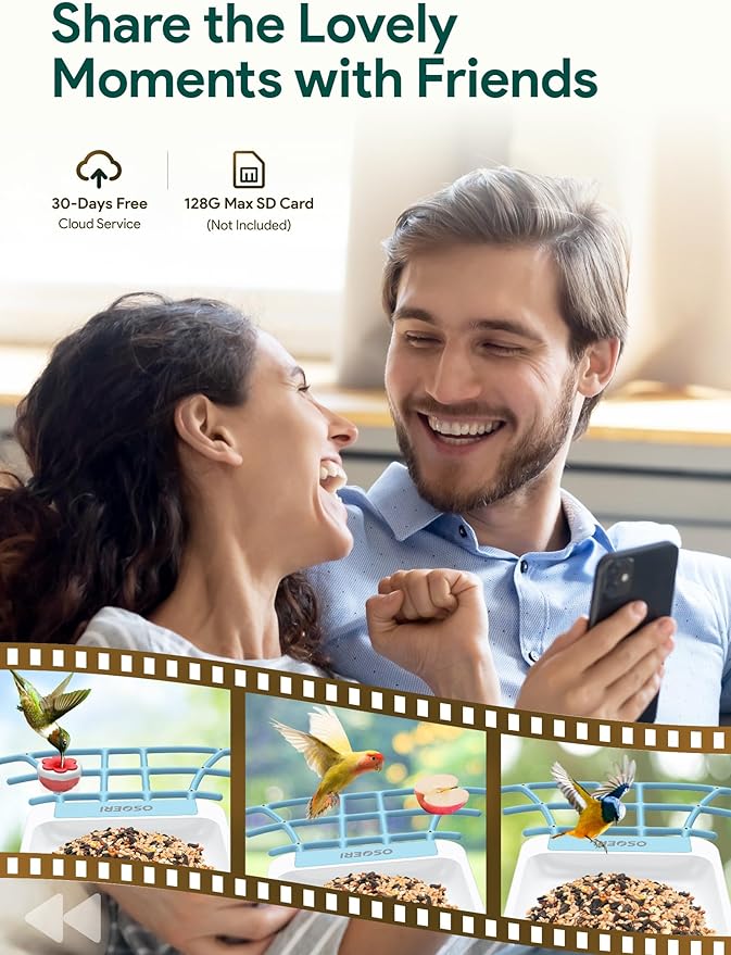 - 【The Perfect Gift for Bird Lovers】Smart bird-watching camera can one-click record videos and save them on the cloud (3-day of loop records, 2 years trial) or memory card (up to 128G, not included). The app of outdoor bird feeder can support multiple users and share lovely videos of birds on social media. It will strengthen communication between families and friends, ideal present for birthdays, Mother's Day, Father's Day, Christmas, or any special occasion.
