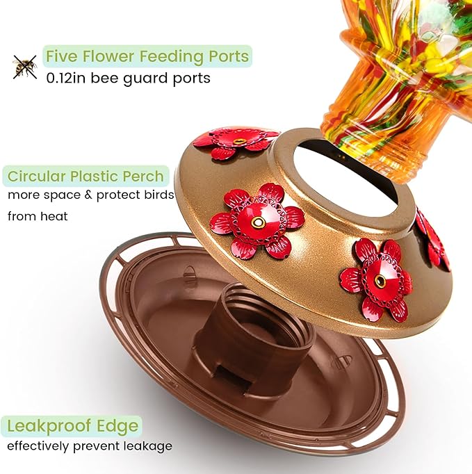 - Feeding Ports: Five red flower shape feeding ports with circular perch, enough space for more hummingbirds to perch and feed at the same time