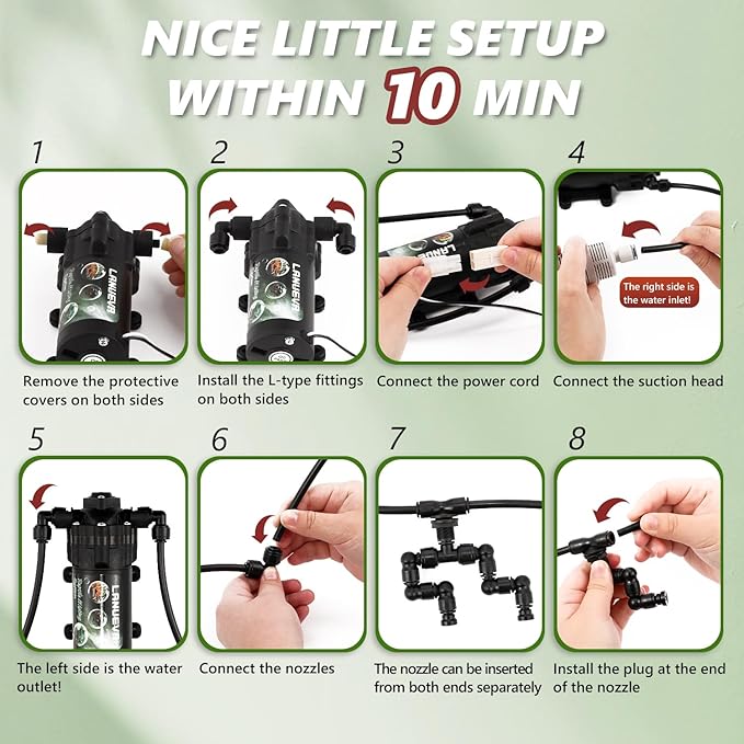 - EASY TO ASSEMBLE The kit offers all accessories you need: silent water pump*1, single nozzles*4, double nozzles *2, filter head *1, 5 meters water pipes *1, nylon ties *10, fixing clip*4, water pipe plug *2, R-clamp *6, etc. The installation is comprehensible and can be completed within 10 minutes by following the instructions. This quiet and automatic misting system is a great addition to any reptile enthusiast’s toolkit.