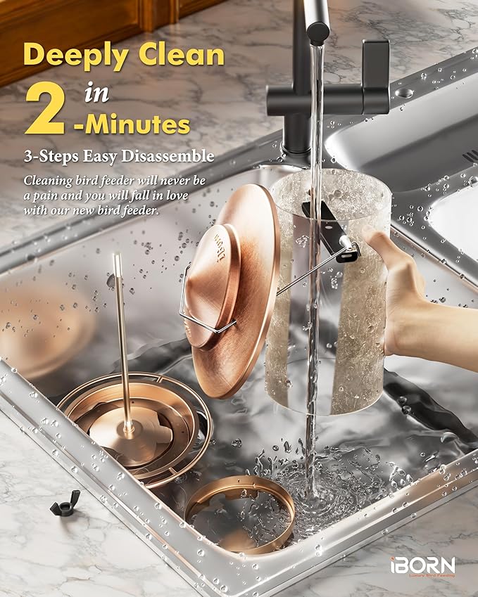 - 【3-Step Quick Clean – No Tools, No Hassle!】Say goodbye to complicated cleaning! Just snap apart in minutes with no screws or tools required. Every piece detaches for thorough water cleaning, water effortlessly removes dust and seeds, then gently wipe with a cloth – Like New in Seconds,ensuring fresh, healthy seed for your feathered visitors.