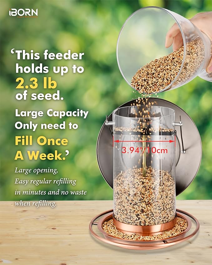 - 【2.2lbs Large Capacity-Attracting More Birds Coming】Compare those mini sized birdfeeders, iBorn large 2.2lb capacity ensures a constant food supply that keeps birds lingering in your yard longer. As they recognize your feeder as a reliable dining spot, they'll naturally invite their feathered friends - turning your space into a lively bird social hub! Watch your garden transform into a vibrant avian gathering place with this worry-free wild bird feeders.