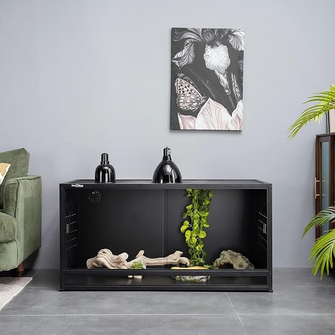 - 【Sturdy PVC Enclosure with Support Bars】: Equipped with support bars on the top screen, Toxirium reptile tank ensures secure placement of lighting fixtures without the risk of falling. The bottom panel also features support bars, guaranteeing stability even when adding decorations weighing up to 100 lbs.