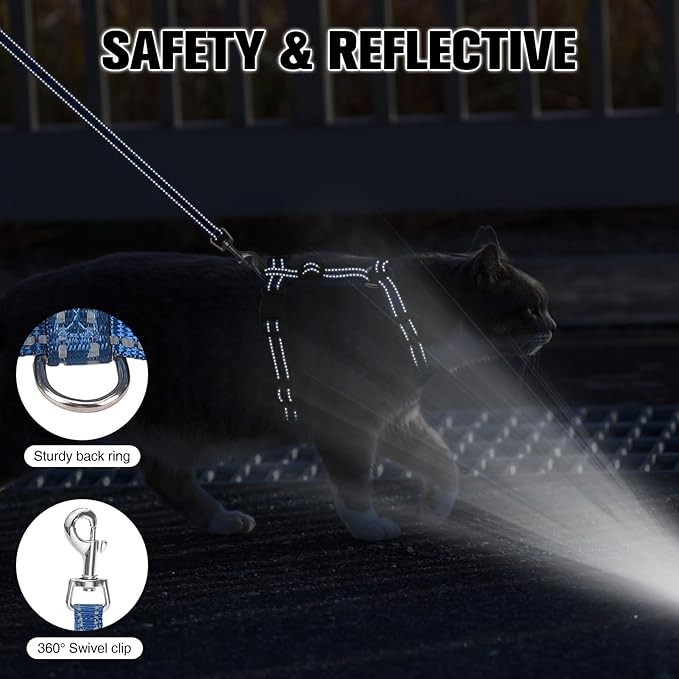 - [REFLECTIVE CAT HARNESS] The reflective trims of the pet vest harness and leash ensure good visibility at night, safe and fashion while out for a walk; This cat harness and leash for walking escape proof is ideal for daily walking, jogging, training, and any outdoor recreations. Also a great cat harness when you're taking your kitty to an unfamiliar place, such as the vet or groomer.