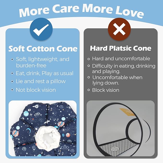 - [Comfy & Soft Collar] Made of high-quality soft fabrics filled with breathable cotton, the cone collar ensures your cat's comfort while wearing it. This allows your pet to eat, drink, sleep, and play as usual. They can maintain an unobstructed view of their surroundings and move with ease!