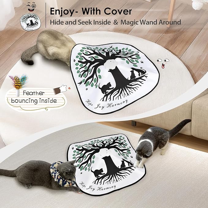 - 🐱【4-in-1 Interactive Entertainment Cat Toy】ORSDA automatic cat toy comes with a removable play blanket which allows the toy to move unpredictably,then you can just see all those cat predator instincts energizing them they can hardly contain themselves! When your cat gets tired of playing with the cover, remove it and the long spinning wand entices your cat to pounce, while the feathers that pop out of the holes stimulate a game of whack-a-mole.