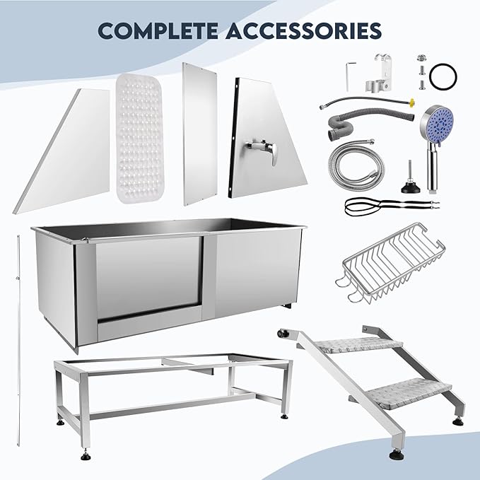 - 🐈Shampoo Rack & Shower - This dog grooming tub is equipped with multi-function high-pressure faucet which could much efficiently shower and clean up this dogs and stainless steel shampoo rack for placing the bath dew and other necessaries shower items, 2 dog leashes is fexible for fixing when washing dogs