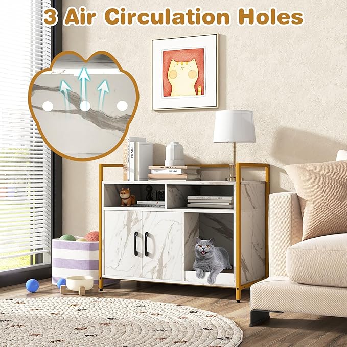 Tangkula Litter Box Enclosure, Modern Cat Litter Box Furniture with Metal Frame, Scratching Board, Storage Compartment, Hidden Cat Washroom (Marble White)
