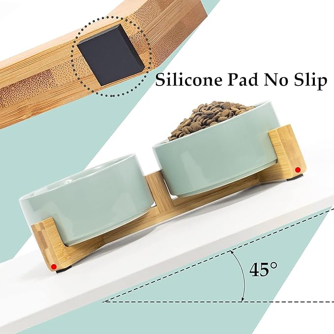 - [Double Bowl Design]:One dog bowl for food and one for water, Each ceramic cat bowl has a Unique wooden stand, raising the dishes closer to your pet for more comfortable eating