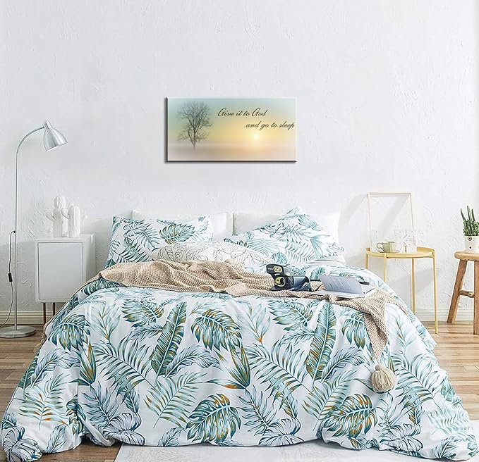 Lasdel Canvas Wall Art of Misty Sunset & Tree Plant Picture For Bedroom Home Above Bed, White Country Wood Sign For Bathroom, Give It To God & Go to Sleep Artwork Decor, Inner Frame 20x40 Inches