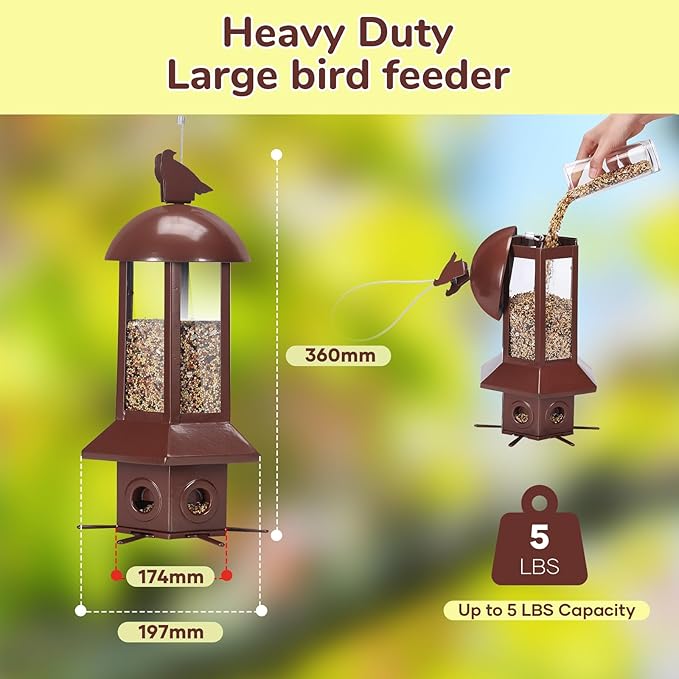 - Generous Capacity: With its large capacity, this bird feeder has a capacity of 5.06lbs,our bird feeder can hold a significant amount of bird food, reducing the frequency of refills.Easy to clean and maintain, this feeder ensures that both birds and birdwatchers can enjoy a sanitary environment.Spend less time refilling and more time enjoying the sight of beautiful birds in your garden.