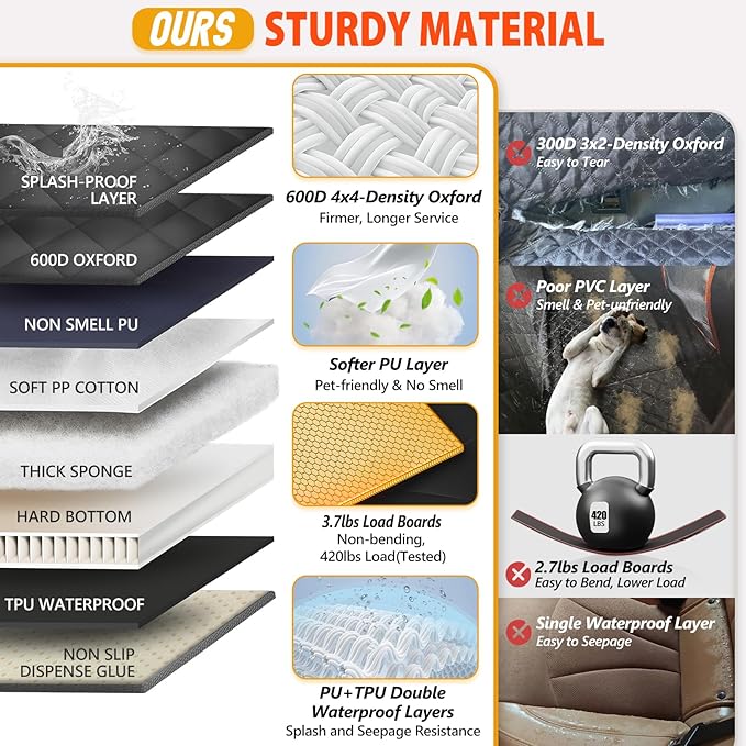 - 【STURDY MATERIAL AND NON-SLIP】 ROUWINNE backseat extender for dogs adopts premium material with 7 layers. First 4X4-density oxford cloth better than other 3x2-density in the market, more sturdy and easy to clean. PU Coating Layer is the first waterproof layer, Softer and no smell better than other pvc layer. And Paired with TPU waterproof layer, double waterproof layer better than other one layer waterproof layer. Bottom non-slip dot rubber makes dog cover more secure, preventing your dog from slipping.