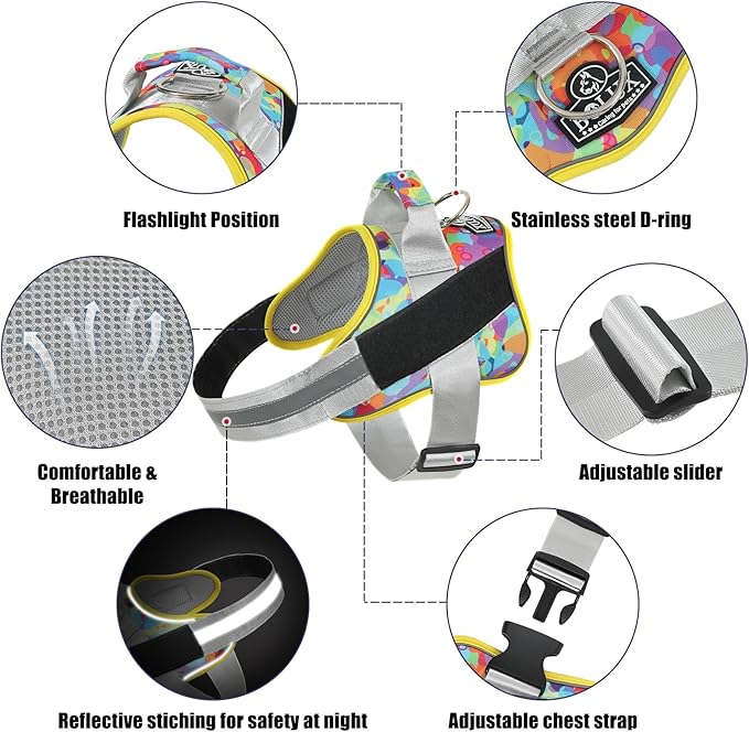- OUTDOOR HEALTHY: Puppy no pull dog harness with reflective straps to ensure your dog is highly visible and keep dogs safe at night. You can connect the dog leash on the D-ring and with handle is easy to control on crowded streets. The high-end pet harness is perfect for daily walking, running, hiking, training, hunting, outdoor adventure and more!