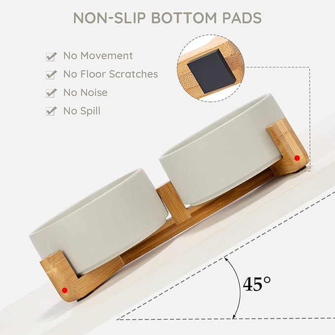 - [Double Bowl Design]:One dog bowl for food and one for water, Each ceramic cat bowl has a Unique wooden stand, raising the dishes closer to your pet for more comfortable eating