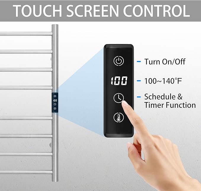 - [TOUGH SCREEN CONTROL]: Manually to turn on/off anytime. Countdown Timer function from 1 hour to 8 hours. Temperature control from 100°F to 140°F.