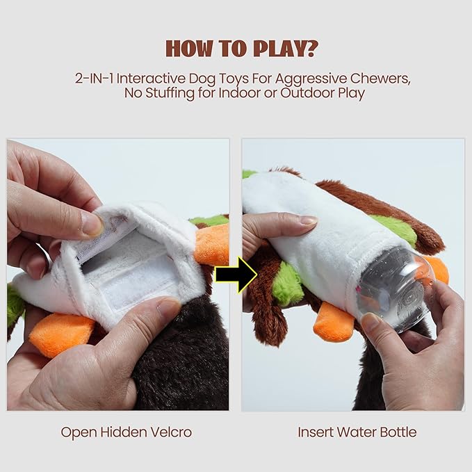 - Keep Your Dog Excited: Each toy features a squeaker in the head and crinkle paper in the tail, with a space to insert a plastic bottle for added crunch. These sound elements capture your dog’s attention, encourage playment, and ensure hours of fun. Protect your dog’s emotional health with this engaging bottle toy.