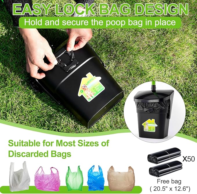 - [UPGRADED BAGS CLIP] For bags constantly shift or even fall off during use, this poop scooper for dogs features an enhanced locking clip designed on the trash bin to secure the bag in place. Additionally, to ensure durability and prevent bag tearing during use, we provide 50 bags that are three times thicker than regular garbage bags upon receipt. You can start using them immediately. Everyday household garbage bags can also be used interchangeably