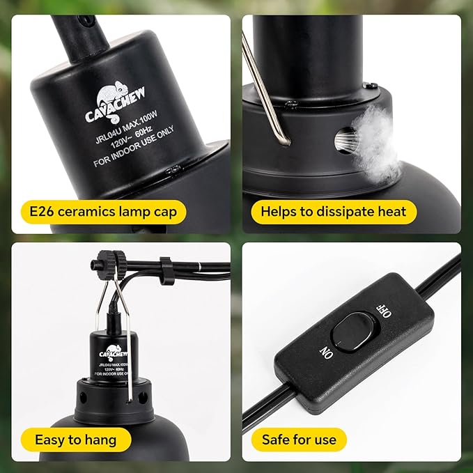 - Easy & Safe for Use: CAVACHEW reptile heat lamp fixture uses independent switches and hooks, easy to install and safe for use. Equipped with heat dissipation holes, which can extend the service life of the bulb.