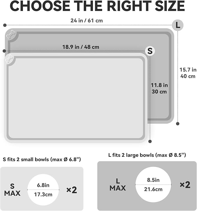 - Keeps Floors Clean: Say goodbye to messy floors! The VIVAGLORY flexible pet feeding mat is made from naturally waterproof and non-slip silicone, providing enhanced grip to reduce skidding during mealtime. Plus, the raised edge effectively catches spills, preventing them from spreading onto your floors and protecting against stains. This helps maintain a tidier feeding area. The dog placemat is available in two sizes: Small for 1-2 small bowls, Large for 1-2 medium or large bowls