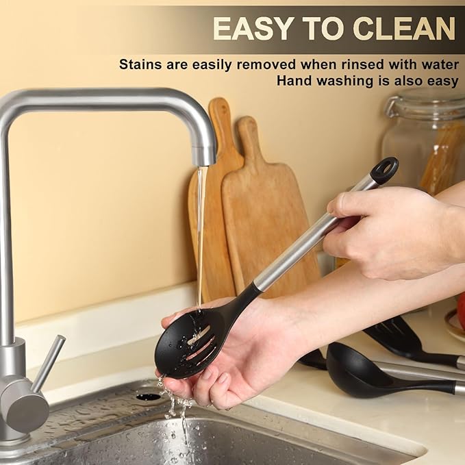 - 【High Quality & Exquisite Craftsmanship】 Our spatula and spoon sets are made of food grade silicone and stainless steel, the nanotechnology makes the silicone head and stainless steel connection more stable. Our high-quality kitchen utensils are polished with a special oil to prevent them from getting rusty. Heat resistant is up to 350 F/180℃. Even if the cooking utensils are used in the high temperature environment of frying, you don't have to worry that it will melt
