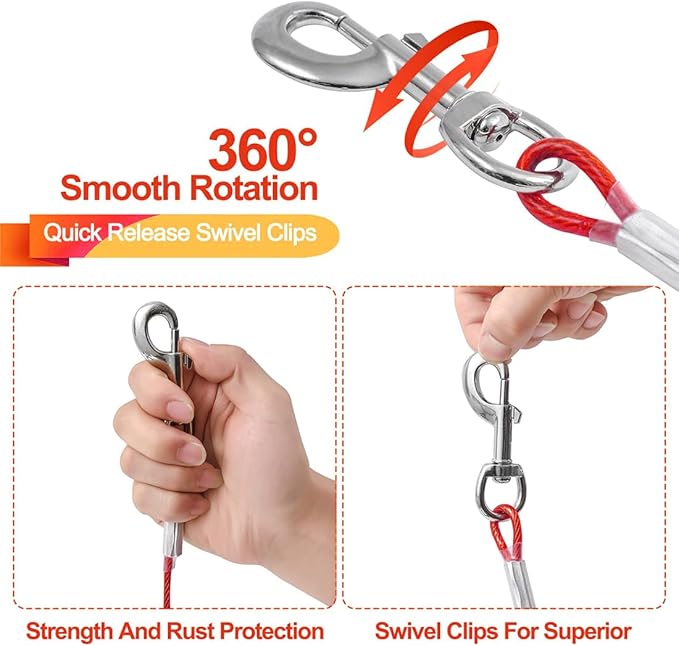 - 【Heavy-Duty Dog Tie Out Cable】Made from heavy-duty steel wire with an anti-rust PVC coating, this durable dog leash cable is built to last. Its double-crimped ends provide extra strength, ensuring it securely holds dogs up to 125lbs.