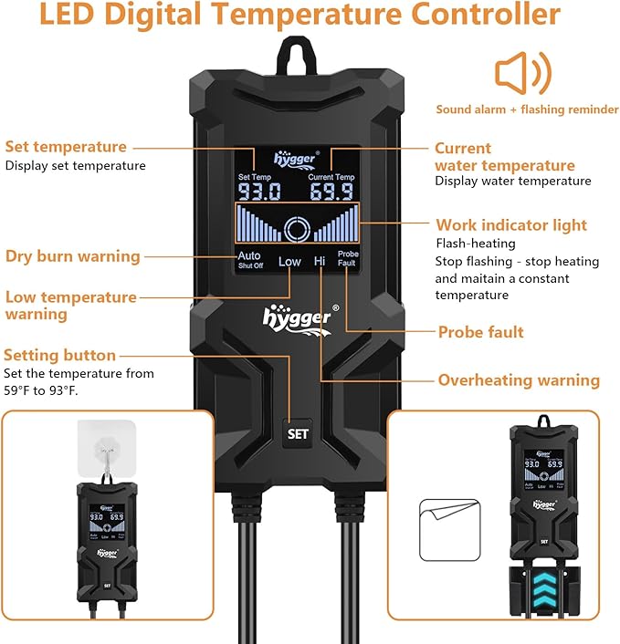 - 【How to ensure safety? 】Our aquarium heater will provide Danger Warning through the water temp. sensing system. The external controller can display Error Codes and issue Alarm Prompts, Overheating-HH, Low temperature-LL, Dry burning-L1. Through the intelligent adjustment of the chip, the heater stops heating when the water tempe. exceeds 93 ℉, and automatically turns on the heating when it is lower than 59 ℉. Keep the fish safe. We also offer a 12-month free warranty on this product.