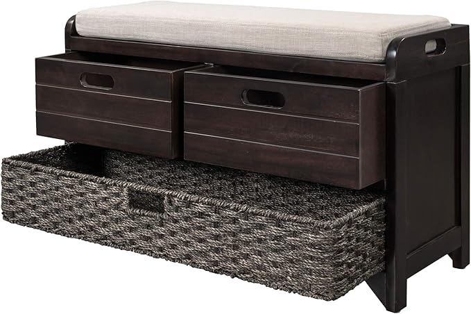 - Versatile Use: Place this rustic storage bench anywhere in your home with its highly versatile design that will compliment a variety of spaces. Enjoy the thick cushioned upper to take a breath or relax on the bench, the basket and 2 drawers make this piece the perfect contender for shoe storage in your hallway or an organizer in bedroom or living room.