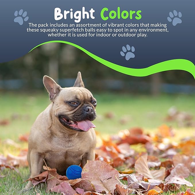 - π’ Pack Includes - 6 X Durable Squeaky SuperFetch Balls for Dogs in 6 colors ! Each chew toys measures 1.5 Inch in diameter and comes with a white mesh net bag for easy storage.