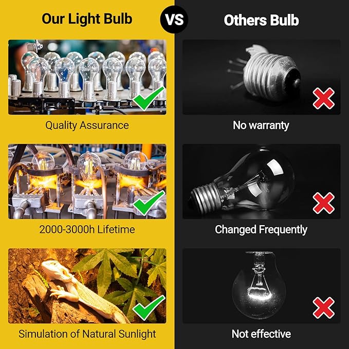 - 【Long Service Life】Adopt updated vacuum aluminizing process technology, the efficiency of the heat lamp bulb increase by 35% and save more energy. Good quality results from upgraded process and the reptile heat lamp can be used over 2000 hours, max 3000 hours.