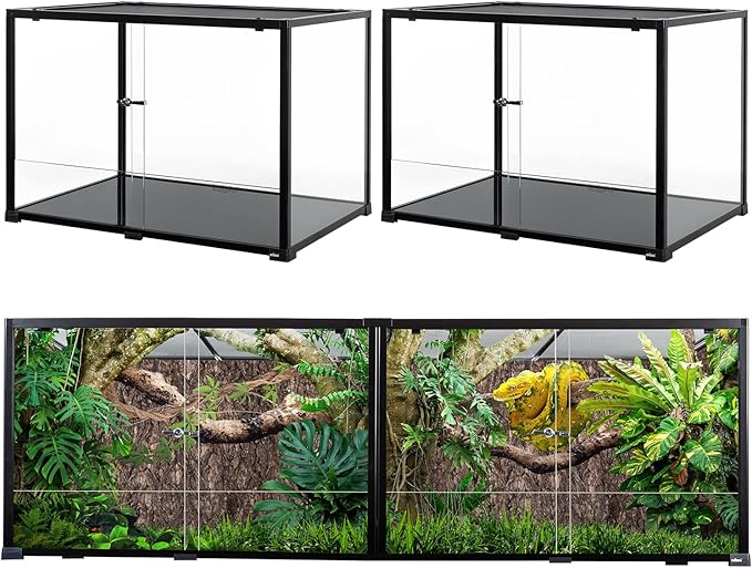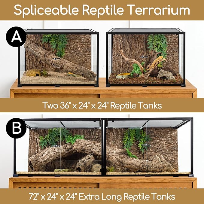 - 【Spliceable Reptile Tank】Upgrade spliceable design. This 72" x 24" x 24" reptile terrarium consists of two same size reptile tanks (36" x 24" x 24"), you can use these two tanks individually to allow your pet to live independently. And also can remove the middle glass panel as a full-width large reptile terrarium to provide your pet friend plenty of room to grow and live.