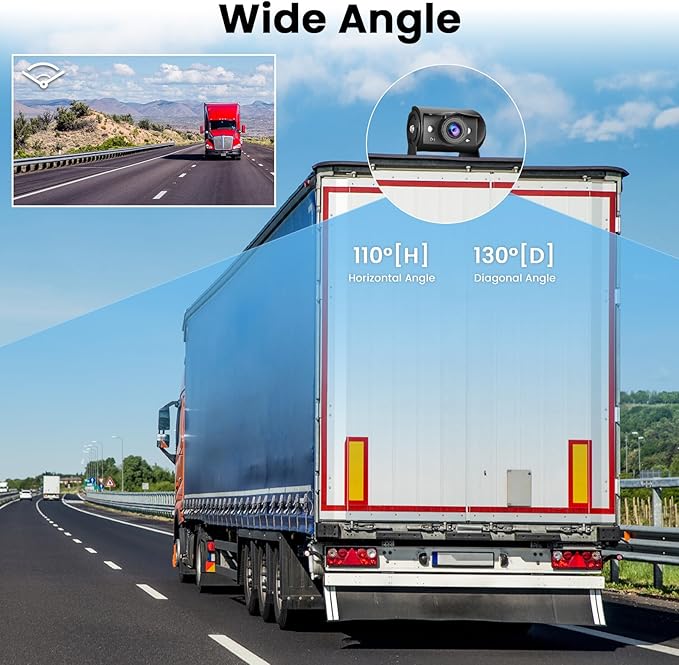 - 【IP69 Waterproof & Wide Angle】 Backup camera monitor kit with IP69 waterproof technology allow you to view the image in raining day. Compared with previous plastic camera, you don't have to worry about this cameras getting water. With 110° horizontal and 130° diagonal angle, which efficiently reduces the blind spots, ensuring drive safety