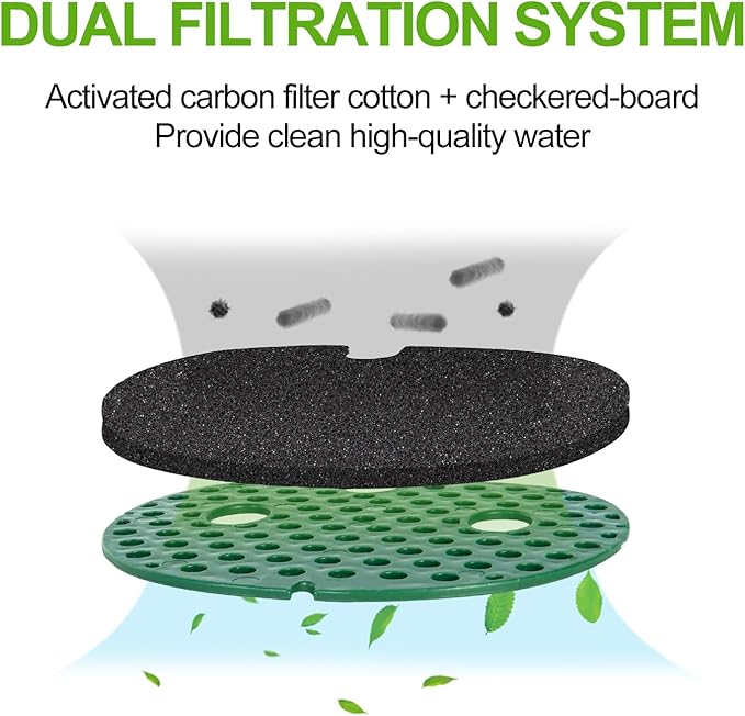 - 【Dual Filtration System】The reptile water dispenser has double filter system, activated carbon filter cotton plus checkered-board to provide clean high-quality water. Safe and solid ABS material is easy to clean and without any harmful substance