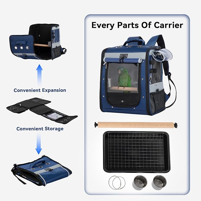 Petsfit Bird Carrier with Anti-Pecking Band,Bird Backpack Carrier with 2 Level Height to Adjust Standing Perch and Shade Cover Blue