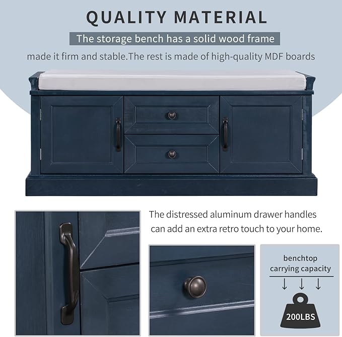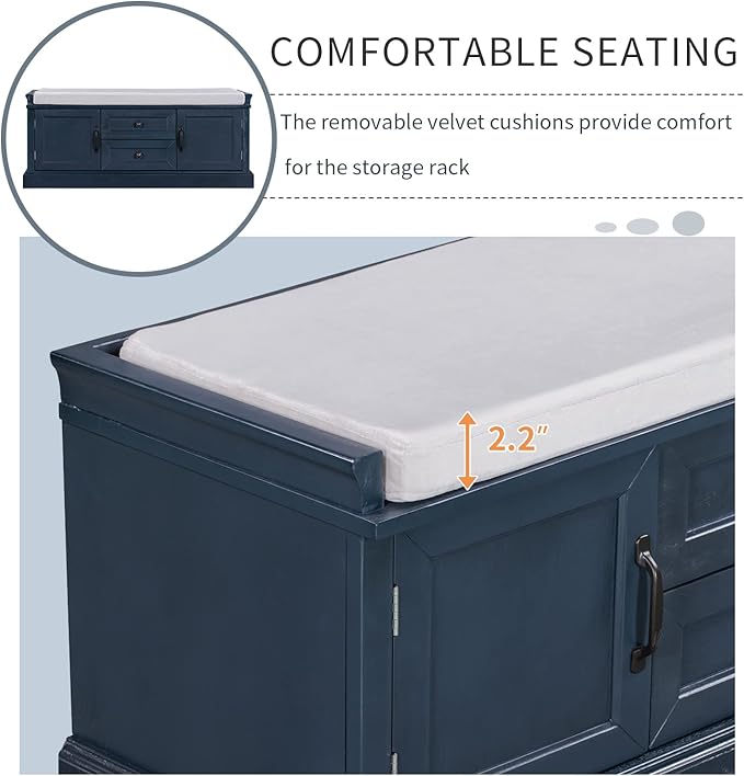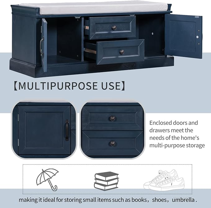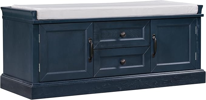 Storage Bench with 2 Drawers and 2 Cabinets, Pine Wood Shoe Bench with Removable Cushion for Living Room, Entryway 42.5" L x 15.9" W x 17.5" H (Antique Navy)