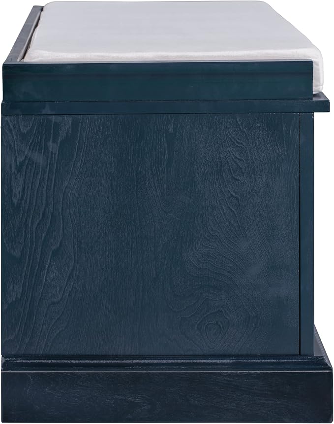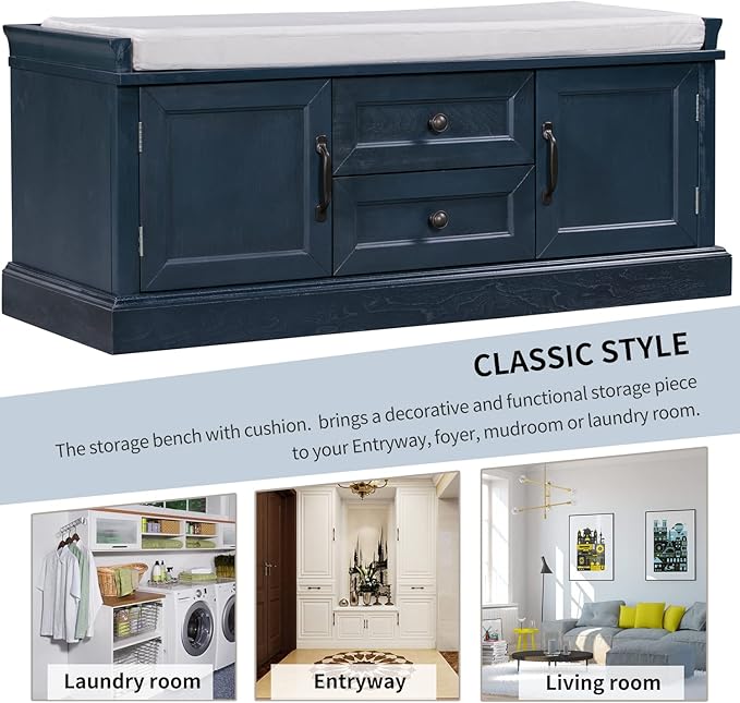 - The storage bench with cushion brings a decorative and functional storage piece to your Entryway, foyer, mudroom or laundry room. The distressed aluminum drawer handles can add an extra retro touch to your home.