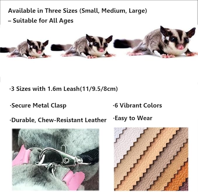 - 1. 3-Pack Sizes for Small Pets Our sugar glider leash and harness set includes three sizes (Large: 4.33", Medium: 3.74", Small: 3.15") and a 1.6-meter leash, making it a versatile choice for small animals like sugar gliders, squirrels, hamsters, rats, and reptiles. Whether you need a harness for sugar glider or a leash for sugar glider, this set adapts to your pet’s growth and ensures controlled outdoor adventures